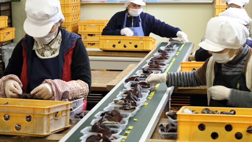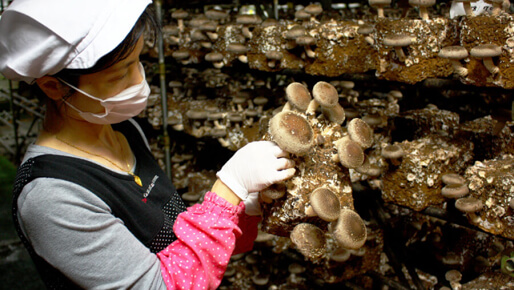 製造した菌床は、環境が厳重に管理された部屋で2〜3ヶ月間熟成させ、専用の施設に移します。たくさんのきのこをじっくりと育て、ひとつひとつ人の手によって収穫し、市場へ出荷しています。